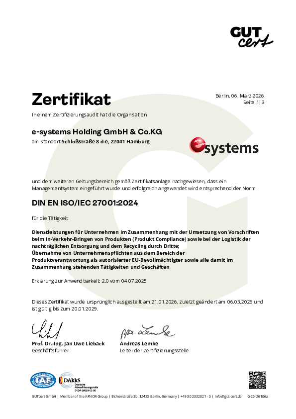 e-systems ist nach DIN EN ISO/IEC 27001 zertifiziert.